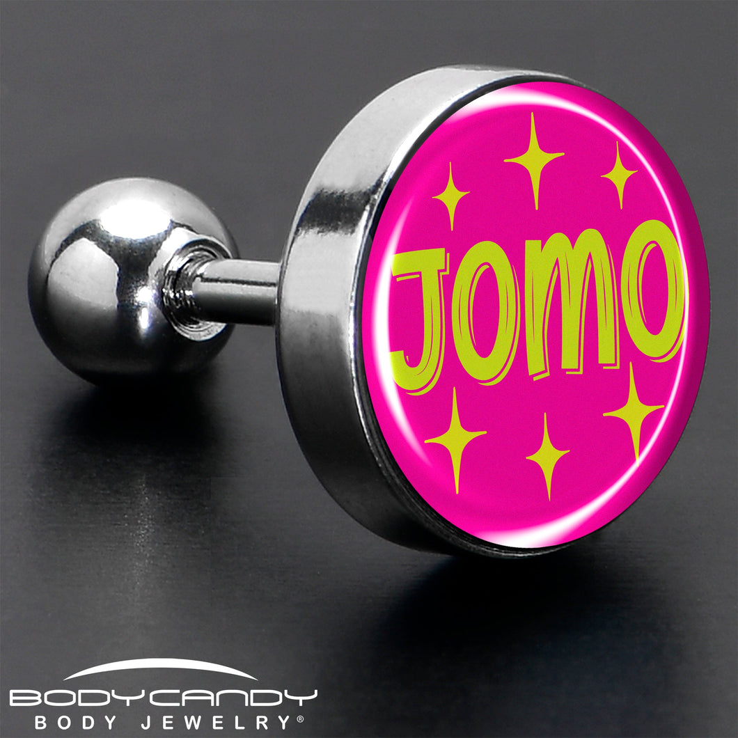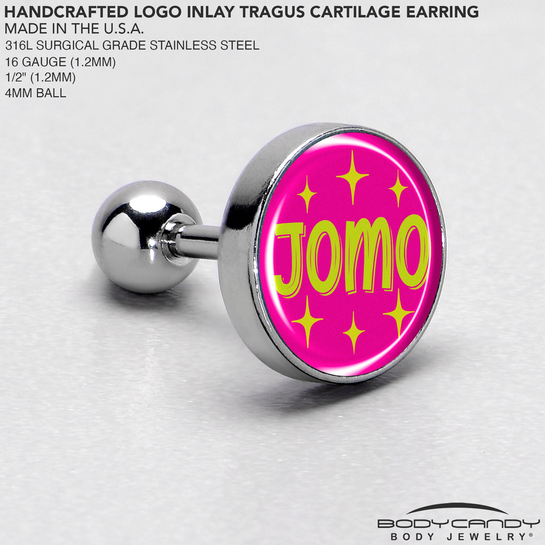 You know you're not missing out on anything so tell the world with this 16 gauge tragus stud. It's made with a 6mm durable 316L surgical grade stainless steel straight barbell with a 4mm ball end. It features a pink disc logo charm with yellow star embellishments. In the center is the acronym JOMO in matching yellow script for a look that's both whimsical and stylish and you can even rock it in multiple piercings including tragus, helix, and some conch piercings. You won't be missing out on colorful fashion when you're rocking this colorful cartilage piercing jewelry.