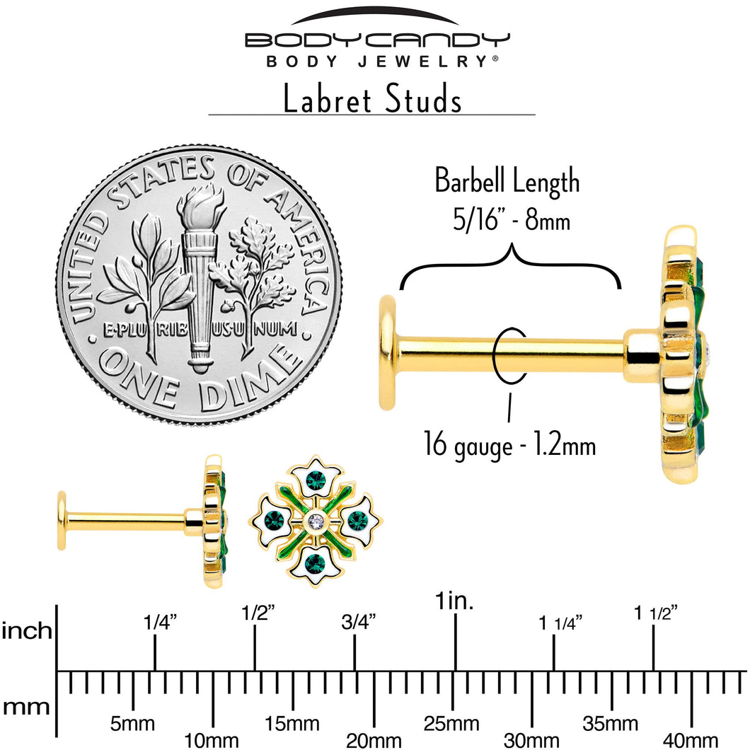 Just in time for festival season, rock a wreath of flowers with this 16 gauge lip ring. It's made with an 8mm gold tone PVD over 316L surgical grade stainless steel straight post with a flat disc end. It features a wreath charm, composed of white flowers, set with green cubic zirconia gem centers and featuring matching green detail. At the center of the wreath is a clear cubic zirconia gem and you can rock it in multiple piercings including lip, monroe, tragus, helix, and some conch piercings. Get a look that's floral and fabulous with this captivating cartilage piercing jewelry.Specifications