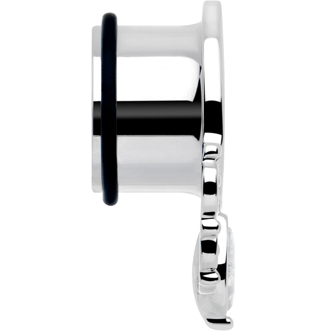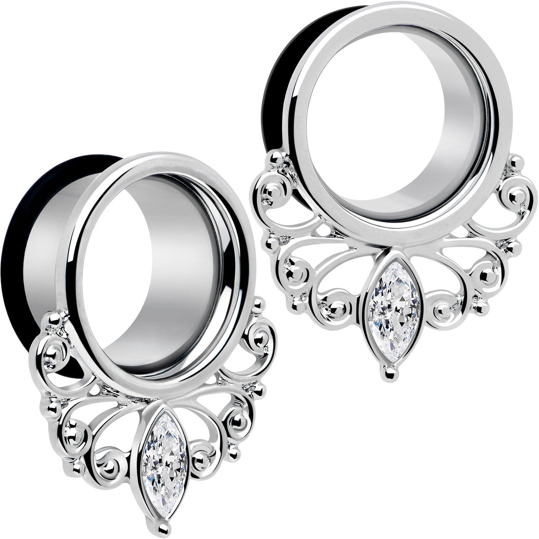 Get an elegant look that screams style with these tunnel plugs for stretched lobes. They're made with durable 316L surgical grade stainless steel and feature a filigree design on the bottom that's embellished with a large clear gem. They also feature a single flare design for comfortable insertion and removal.