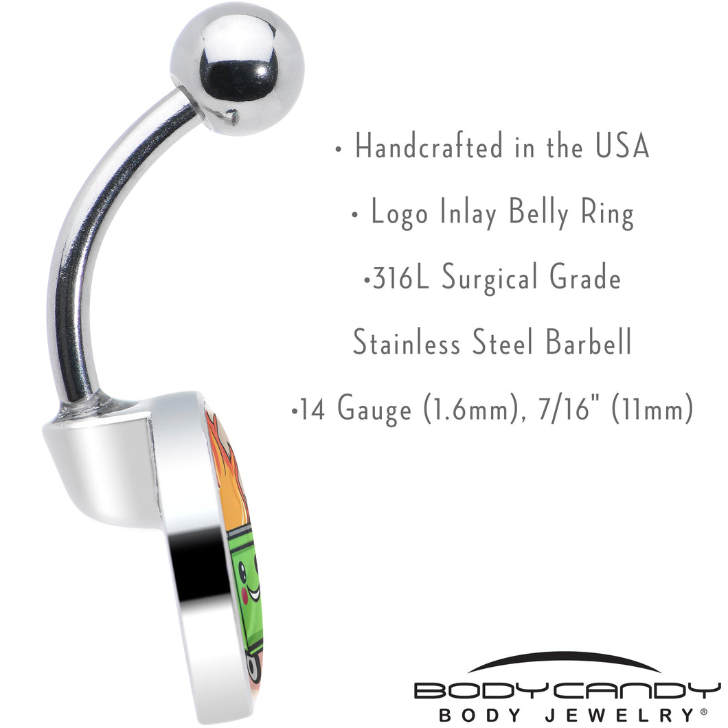 If things aren't going well, add some levity to your look with this 14 gauge stainless steel navel ring. It's made with a 7/16 inch 316L surgical grade stainless steel curved barbell with a 5mm top ball end. The bottom end features a grey disc logo charm that shows a smiling green dumpster with the contents on fire. If it's all going wrong and you're okay with that or you just need some cheering up, this happy dumpster fire is perfect for the job with this stainless steel belly piercing jewelry. Unique artist-drawn logo inlay design surgical steel belly button ring.