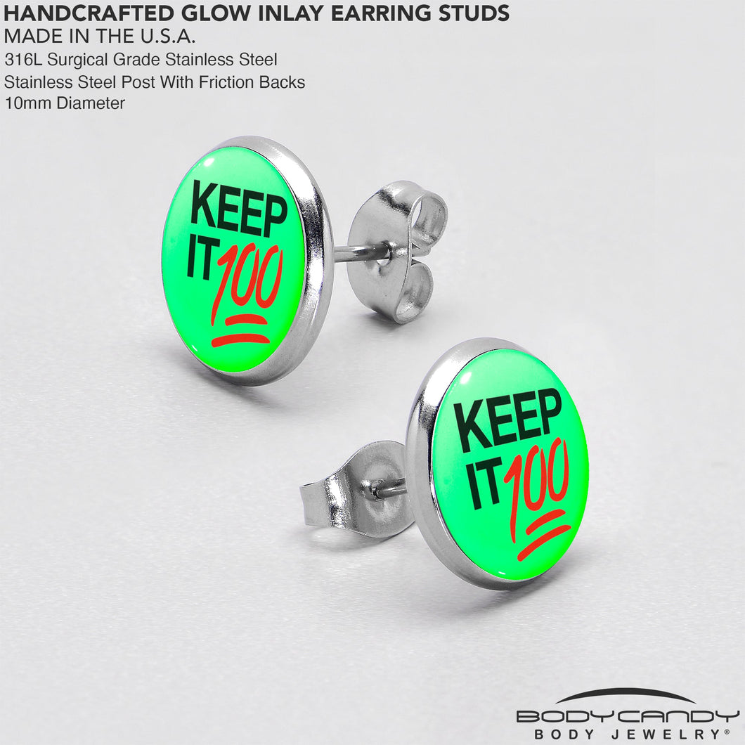 If you want everything maxed out, even with the lights out, get ready to rock these stud earrings for pierced lobes. They're made with stainless steel straight posts with friction backs for a secure fit. Each one features a white disc logo charm that says Keep It 100 with red embellishment and emoji styling. Even better, when the lights go down they glow in the dark. You'll be keeping it 100 no matter the time of day with these glow in the dark pierced earrings. Sold as a set of two.